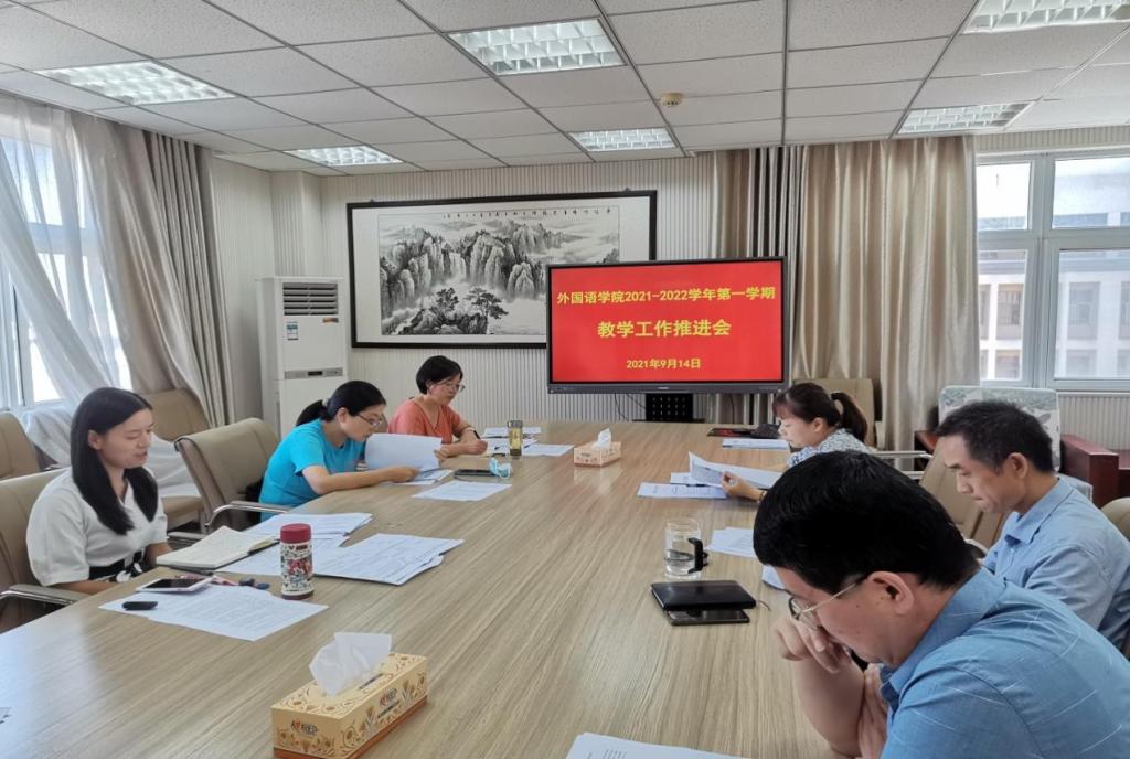在人文楼五楼会议室召开了2021-2022学年第一学期教学工作推进会。英语系主任余运伟、日语系主任张鸿鹏、翻译系副主任曹万忠、商务英语系主任吴倩、第二外语教研室主任傅翀及教务办工作人员共同参加了会议。会议由副院长郭敏主持。