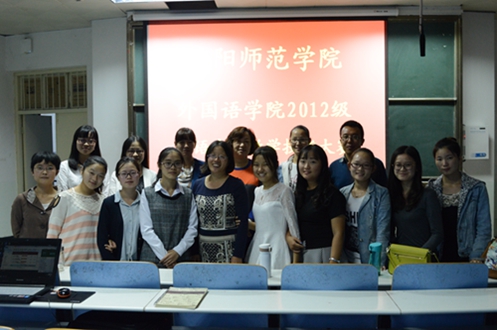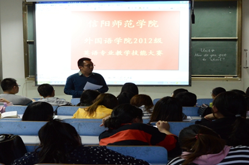 2012级英语专业教学技能大赛在人文楼308教室隆重举行。教师评委余运伟、李明晔、任岳涛以及信阳市第九中学李延老师陪同两百余名学子共同观看了此次大赛。