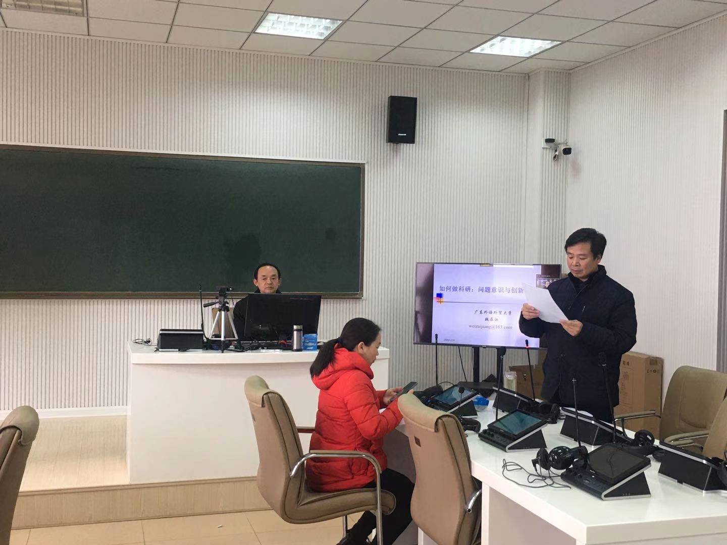 12月28日下午,魏在江在人文楼505教室作了题为“如何做科研:问题意识与创新意识”的学术报告。院长蔡满园主持报告会,学院部分教师和全体研究生共同聆听了报告。魏在江结合当前外语教学与研究的实际,围绕中国学术的独立思考及构建本土化的语言学理论、中国优秀文化如何走出去、外语研究方法论、如何正确处理教学与科研的关系等方面的话题展开论述,并结合自己的科研经历指导青年教师和研究生如何科学选择研究主题。