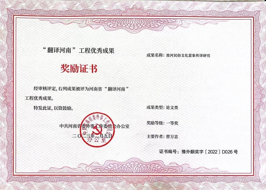 曹万忠老师的论文《淮河民俗文化意象传译研究》获得一等奖,2021级翻译硕士何琼的《翻译目的论指导下建筑物名称的翻译--以周口市关帝庙建筑为例》获得二等奖、2021级翻译硕士邹伟伟的《传播学视域下的河南作家小说海外译介与传播--以邵丽《黄河故事》英译为例》获得三等奖。