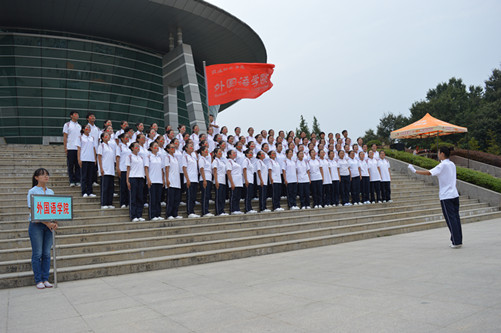 鲜明的旗帜在空中飘扬,同学们面带笑容,不时变换队形,动作整齐划一,高举展示牌,表现出良好的外语学子形象。