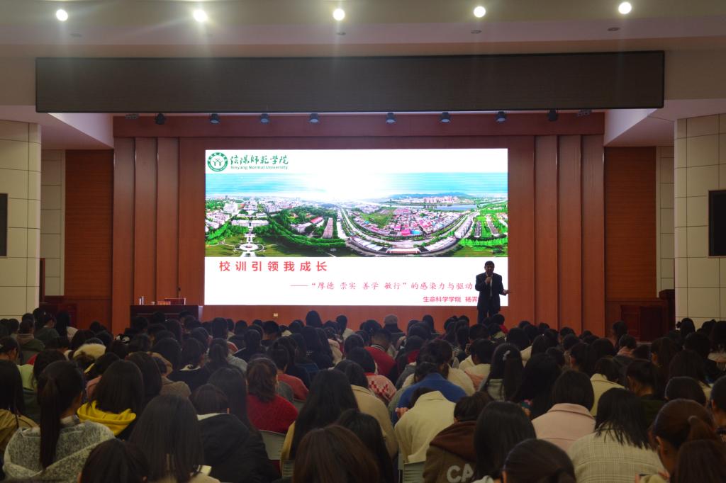 “厚德 崇实 善学 敏行”的校训展开。杨霁虹说,校训是一个学校的灵魂、积淀与凝练,是广大师生共同遵守的基本行为准则。他指出,“厚德”要求我们培养自身的社会公德、职业道德和家庭美德,做到上善若水,德行天下;“崇实”要求我们基础扎实,为人诚实,作风朴实,工作务实;“善学”要求我们主动学习、探索性学习、合作性学习;“敏行”要求我们在提高脚力、眼力、脑力、笔力上多下功夫,练好本领。杨霁虹鼓励青年学子在校训的感染驱动下,成为秀外慧中的“更美师院人”。