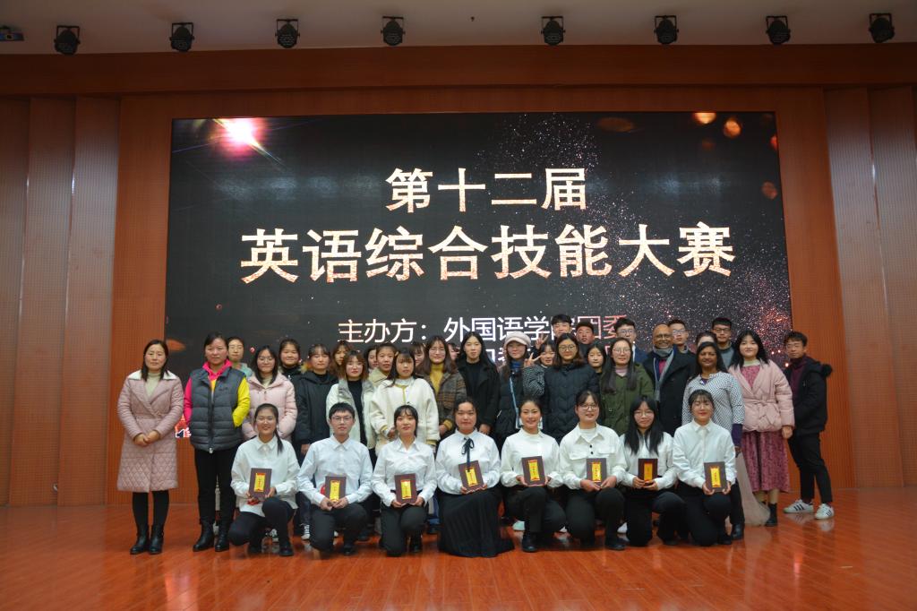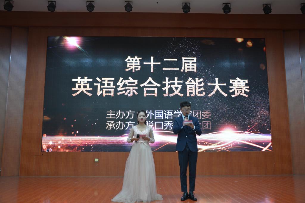在逸夫楼报告厅举办第十二届英语技能大赛。评委老师赵勤、曹悦及外教Taryn Murugan、Karun Murugan与500余名学生共同观看比赛。