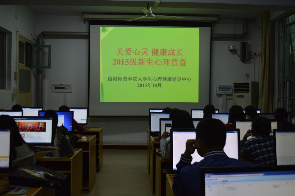 2015级全体新生在科技馆计算机实验机房进行心理普查活动。