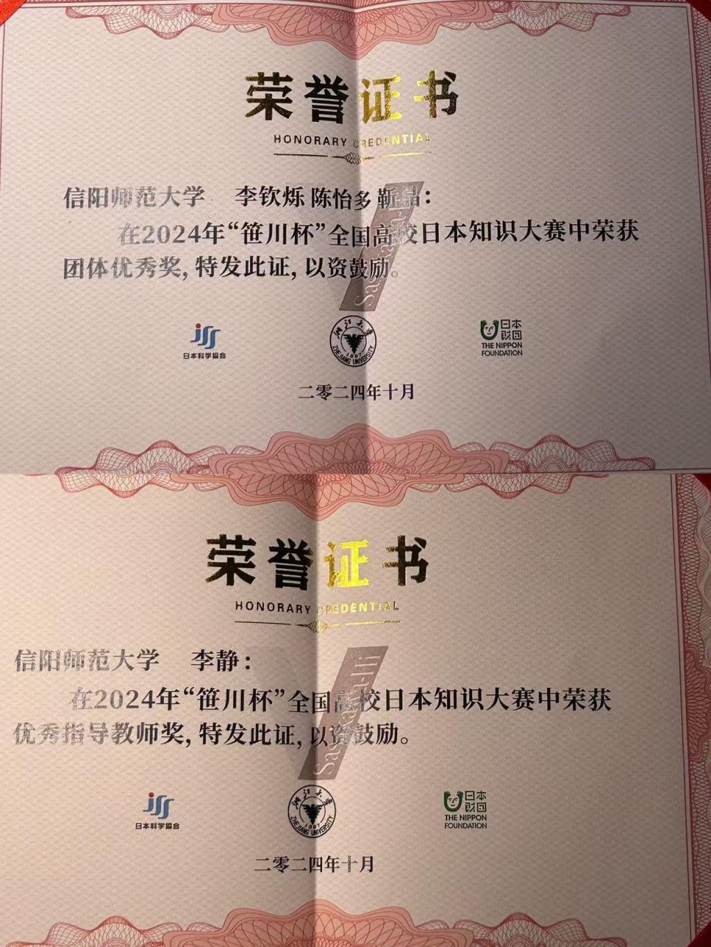 日语专业2022级本科生李钦烁、陈怡多、靳晶三位同学在李静老师的指导下荣获团体优秀奖,李静老师被评为优秀指导教师。
