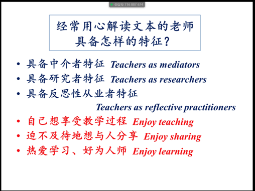 教授、硕士生导师王彩琴以“以文本解读提升课堂实效”为主题的在线学术交流活动。