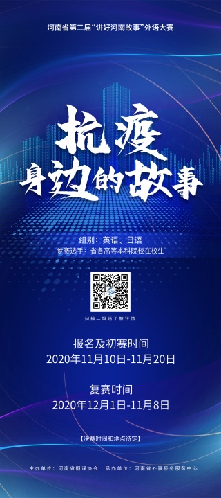 新冠疫情爆发以来,全球各国人民共同积极抗疫,病毒无国界,人类有大爱,在此期间发生了很多动人故事。为了贯彻落实习近平总书记关于“推进国际传播能力建设,讲好中国故事,展现真实、立体、全面的中国,提高国家文化软实力”的讲话精神,用外语分享感动,传播正能量,展示新时代青年的作为和担当,同时为持续发掘和培养更多外语人才,促进河南国际文化交流,助力河南进一步改革与开放,特举办河南省第二届“讲好河南故事”外语大赛。