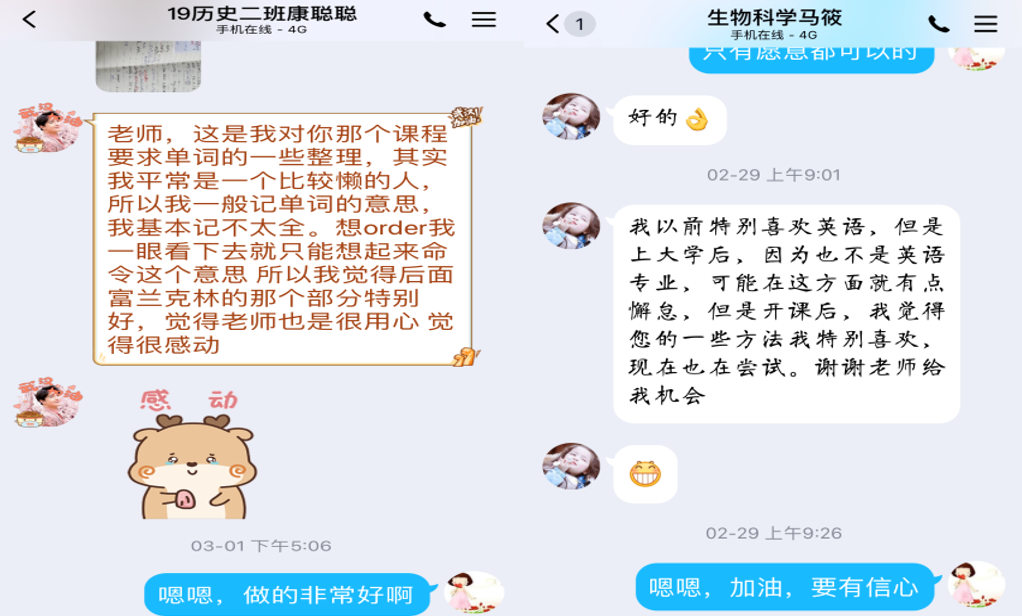 在新视野大学英语读写课程的教学准备过程中,陈老师积极参照爱课程、学银在线以及中国大学MOOC等网络教学平台,不断改进教学方式,更新教学材料。在课后答疑中,陈老师鼓励他们运用网络平台重复观看教学视频,但仍有部分学生提出异议,建议使用和视听说教学类似的授课方式。于是在采纳学生意见的基础上,后续教学内容由她自己进行录制讲解,在积极认真备课的基础上录制教学视频,并积极与学生沟通交流,答疑解惑,积极帮助学生完成学习任务。同时,针对学生提出的英语口语以及单词的发音问题,陈老师在学习通的课程中增加一门选学的语音课程,没有英语语音学基础的同学可以利用此课程进行系统学习,纠正英语发音过程中出现的问题。本课程也受到了较多学生的欢迎。