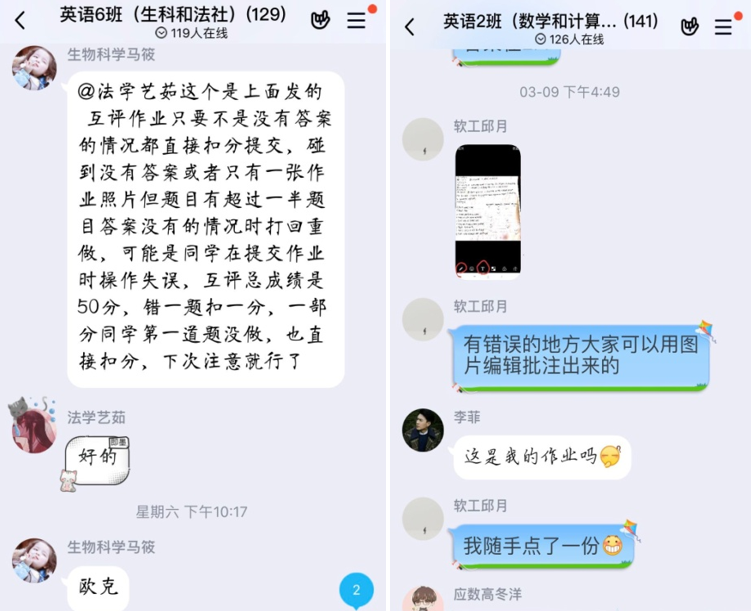 由于本学期学生人数较多,学习通系统使用压力较大,陈老师按照教学班建立QQ英语学习交流群,便于和各班同学进行及时的沟通和联系,并从每个班级群中选出两名学习委员(学生自荐),帮助管理班级和发布通知以及批阅作业等任务。在第二周的作业任务中采取了学生互评的批阅方式,一方面缓解教师备课,录课以及平衡个人生活的压力,更重要的是让同学们在批阅作业的过程中体验新的学习方式,审视自己的问题,修正自己的学习态度,同时促进同学们之间的沟通(互评采取实名的方式)。尽管出现了各种问题,但学生们积极地参与和探索给本课程的授课带来积极的影响。