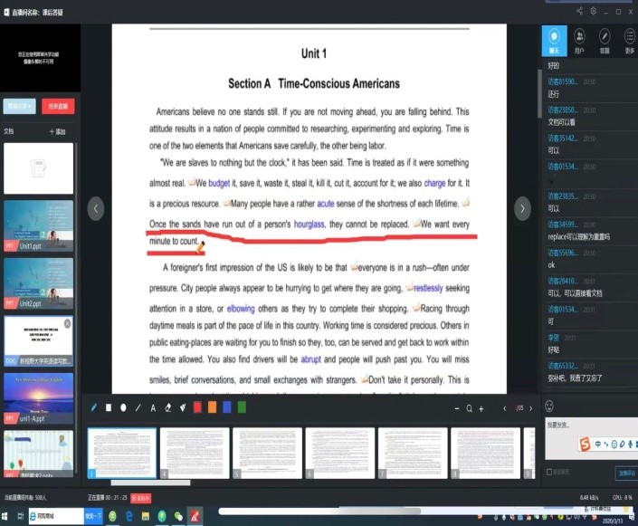 《大学英语》是一门人文类语言课程,学生的课下自主学习尤其重要。在此疫情期间,学生们如何合理安排时间,养成良好的学习习惯对以后的语言学习会有很大的帮助。鉴于此,陈老师在第一周的课程准备中录制了一个20多分钟的课程要求,向学生们说明本学期英语课程的学习内容、上课的基本模式、学生们课下准备、以及可能会进行的课堂和课外活动;加大学生们的阅读训练,同时在学习通作业中增加阅读类作业,阅读材料为四级水平。同时提出一些关于大学英语学习的建议,鼓励同学们积极提出问题,重视与老师和同学们之间的交流。