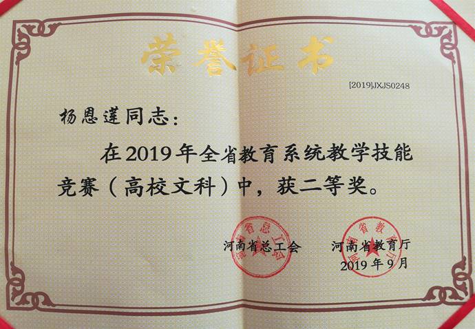 近日,从河南省教育厅、河南省教育工会传来喜讯,我部杨恩莲老师在河南省教育系统2019年度教学技能竞赛中荣获二等奖。