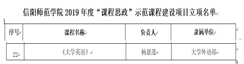根据学校《关于开展“课程思政”校级示范课程建设项目申报工作的通知》(信院字〔2019105号)精神,经部内申报,专家评审,我部杨恩莲副教授主持申报的 《大学英语》“课程思政”校级示范课程建设项目获批。