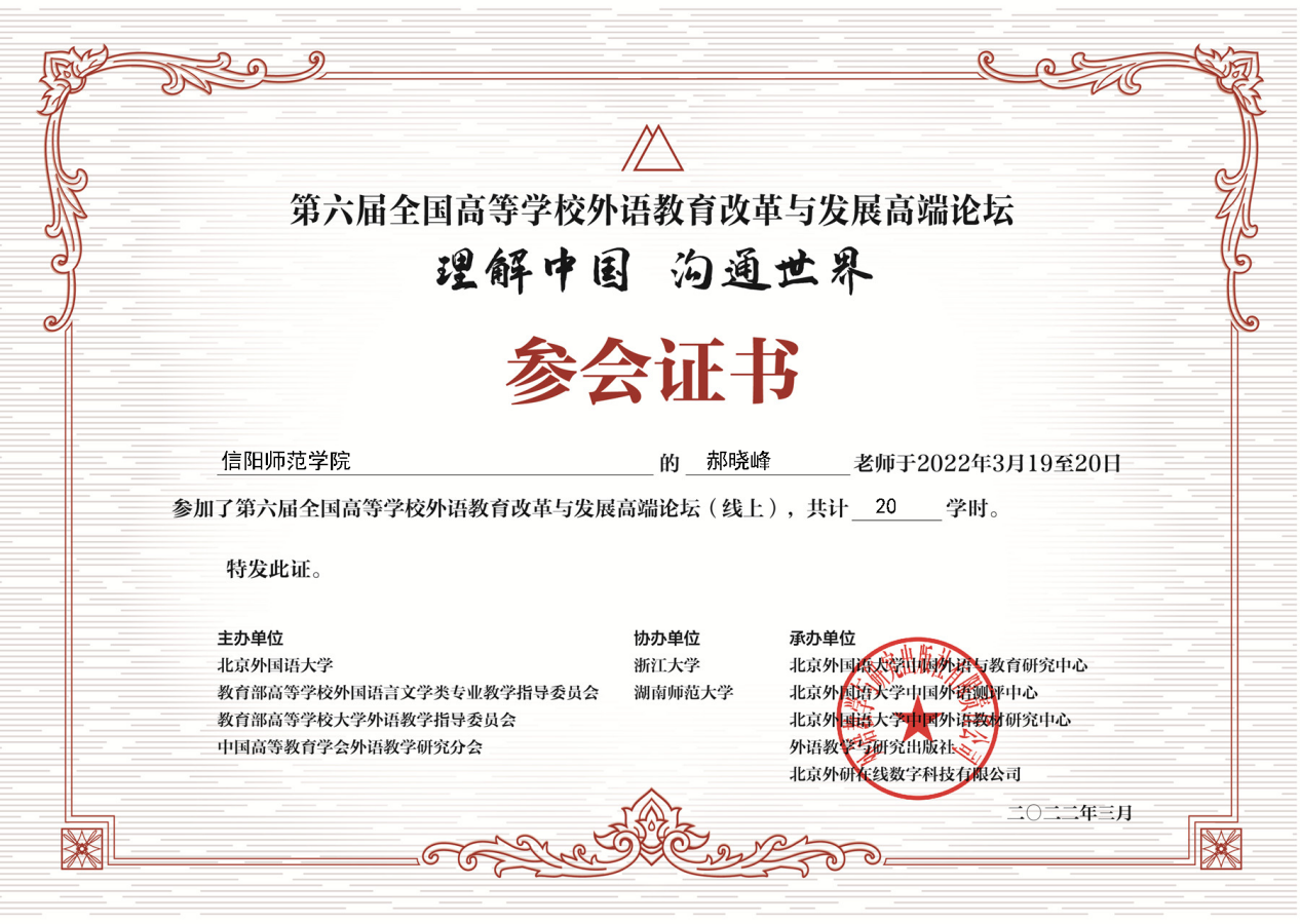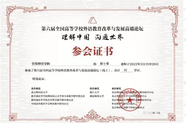 本次高端论坛事关我国高校外语教育改革的新动向,公共外语教研室部分老师认为:本届论坛展现出了中国高等外语教育为党育人、为国育才的坚定信念,预示着中国高等外语教育踔厉奋发、笃行致远的广阔未来。是党和国家为外语教育提出命题、指引方向的会议,是外语教育界专家学者担当使命、共话发展的会议,汇聚多方观点、融合多个视角、展示多维思考,启发外语人立足大局、规划布局,凝心聚力、铸魂育人,做传递中国声音、沟通广阔世界的坚实桥梁,公共外语教研室部分老师获得研修证书。