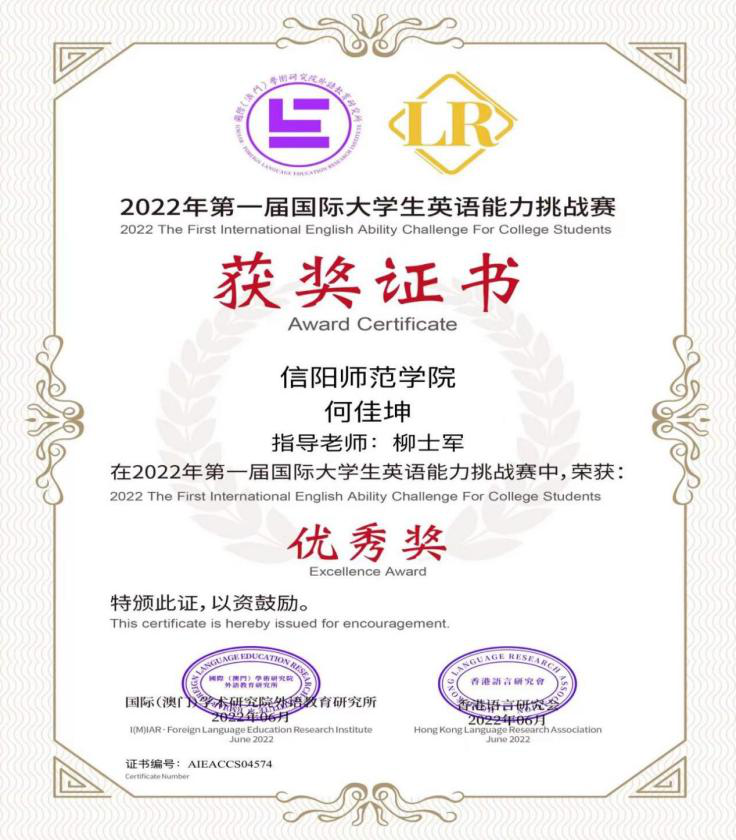 公共外语教研室教师指导学生参加2022年各类英语比赛获佳绩。其中何家坤(指导教师柳士军)获2022年第一届国际大学生英语能力挑战赛优秀奖,李子颖获2022年全国大学生英语作文大赛大学英语组国家级二等奖,洪梦威(指导教师陈丽娟)获2022年全国大学生英语作文大赛大学英语组省级一等奖,王雅萱获2022年全国大学生英语作文大赛大学英语组省级三等奖,曹妍获第二届“外教社·词达人杯”全国大学生英语词汇能力大赛河南赛区本科非英语专业组三等奖,余昌燕获2022年CATTI杯全国翻译大赛初赛大学A组中英(笔译)三等奖,杨菁菁、马灿灿、陈在窑均获2022年第六届普译奖全国大学生翻译比赛英译汉组(初赛)三等奖,李欣茹、马灿灿获2022年全国大学生英语语法竞赛初赛(非英语专业组)三等奖,唐天欣(指导教师柳士军)获2022年创研杯全国大学生英语词汇能力挑战赛全国初赛C类三等奖。
